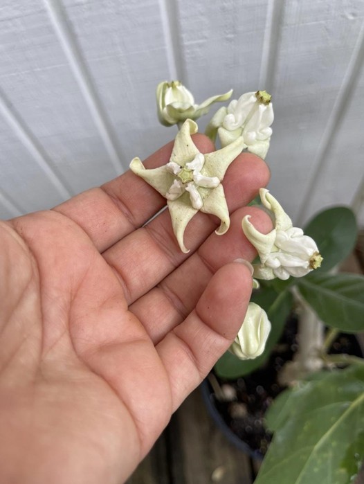 Giant calotrope, also known as Calotropis gigantea or crown flower, is a large shrub or small tree native to India and Southeast Asia, but widely cultivated in tropical regions. It’s known for its large, hairy leaves, showy five-pointed flowers (often purple or white), and its ability to tolerate hot sun, sandy soil, and drought. It’s also used in making Hawaiian leis.