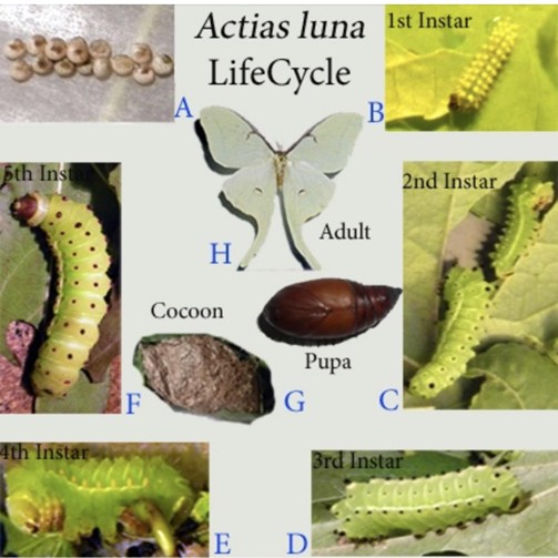 The Luna Moth (Actias luna) is a large, pale green moth with a wingspan of about 4 inches, known for its long, curved hindwing tails and prominent eyespots. Found in eastern North America’s forested areas, this nocturnal insect has a short adult lifespan of only a few days, during which it does not eat, relying on stored energy to mate and lay eggs.