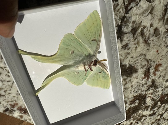 The Luna Moth (Actias luna) is a large, pale green moth with a wingspan of about 4 inches, known for its long, curved hindwing tails and prominent eyespots.